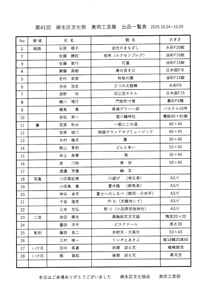 | 2025.10.24-10.29 | 第41回麻生区文化祭美術工芸展開催。 | | |||