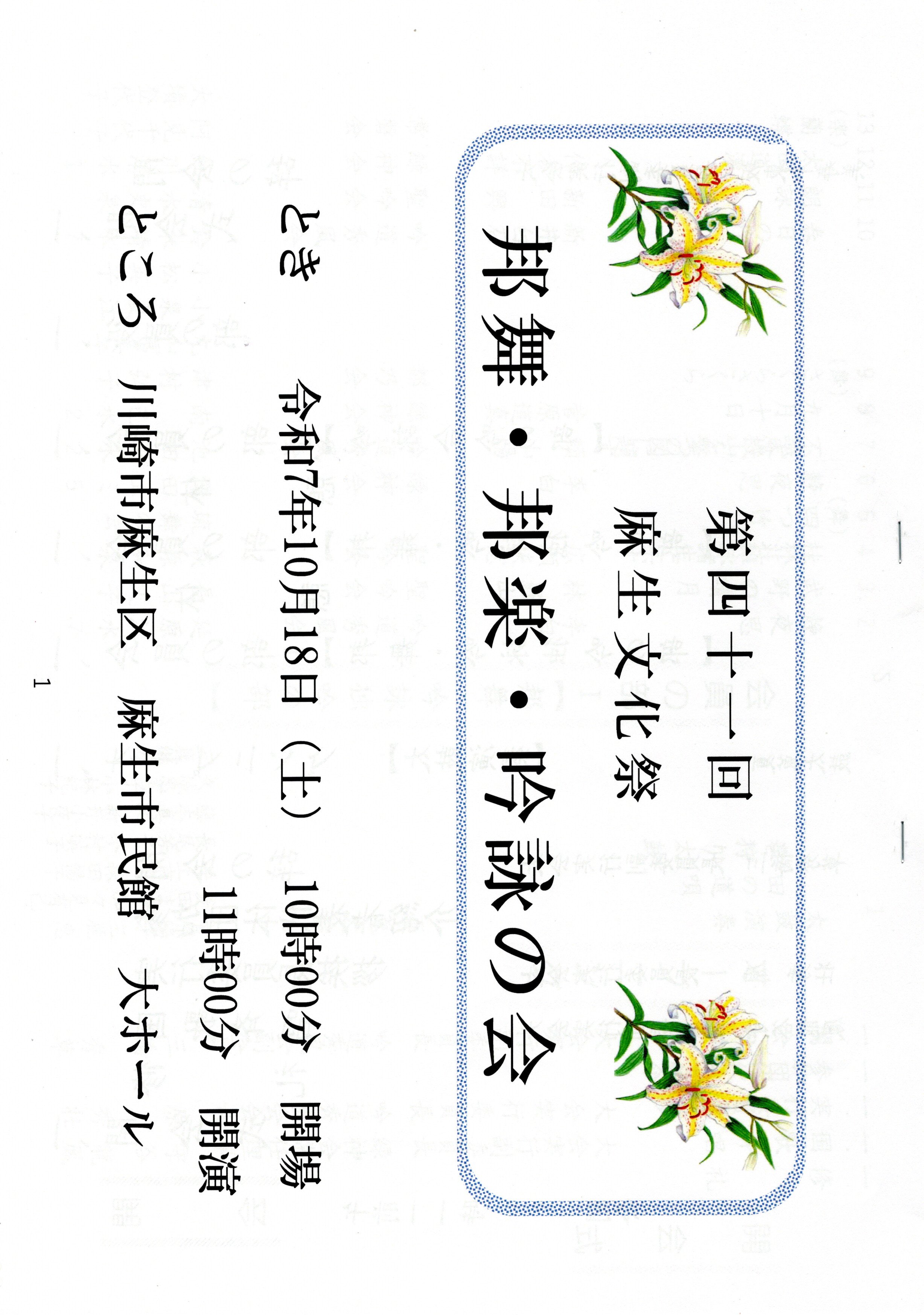 | 2023.10.21 | 第39回麻生区文化祭始まる 「邦舞・邦楽」公演、「俳句大会」がありました。 | ![]() 俳句大会句集 邦舞邦楽パンフ | |||