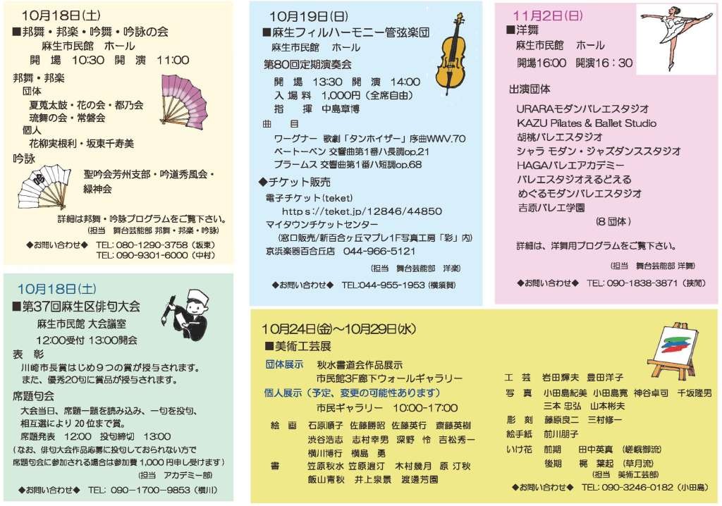 邦舞・吟詠(10/18)、麻生フィルハーモニー演奏会(10/19)、洋舞(11/2)は市民館大ホールで開催されます。
